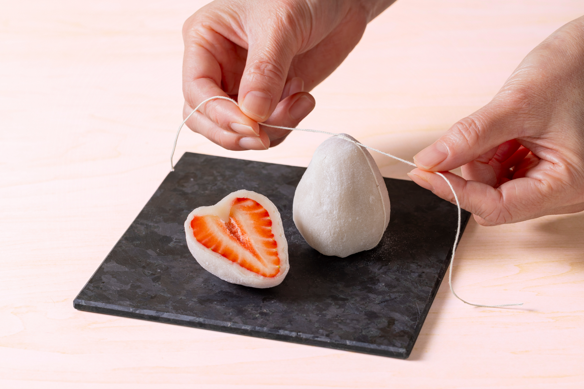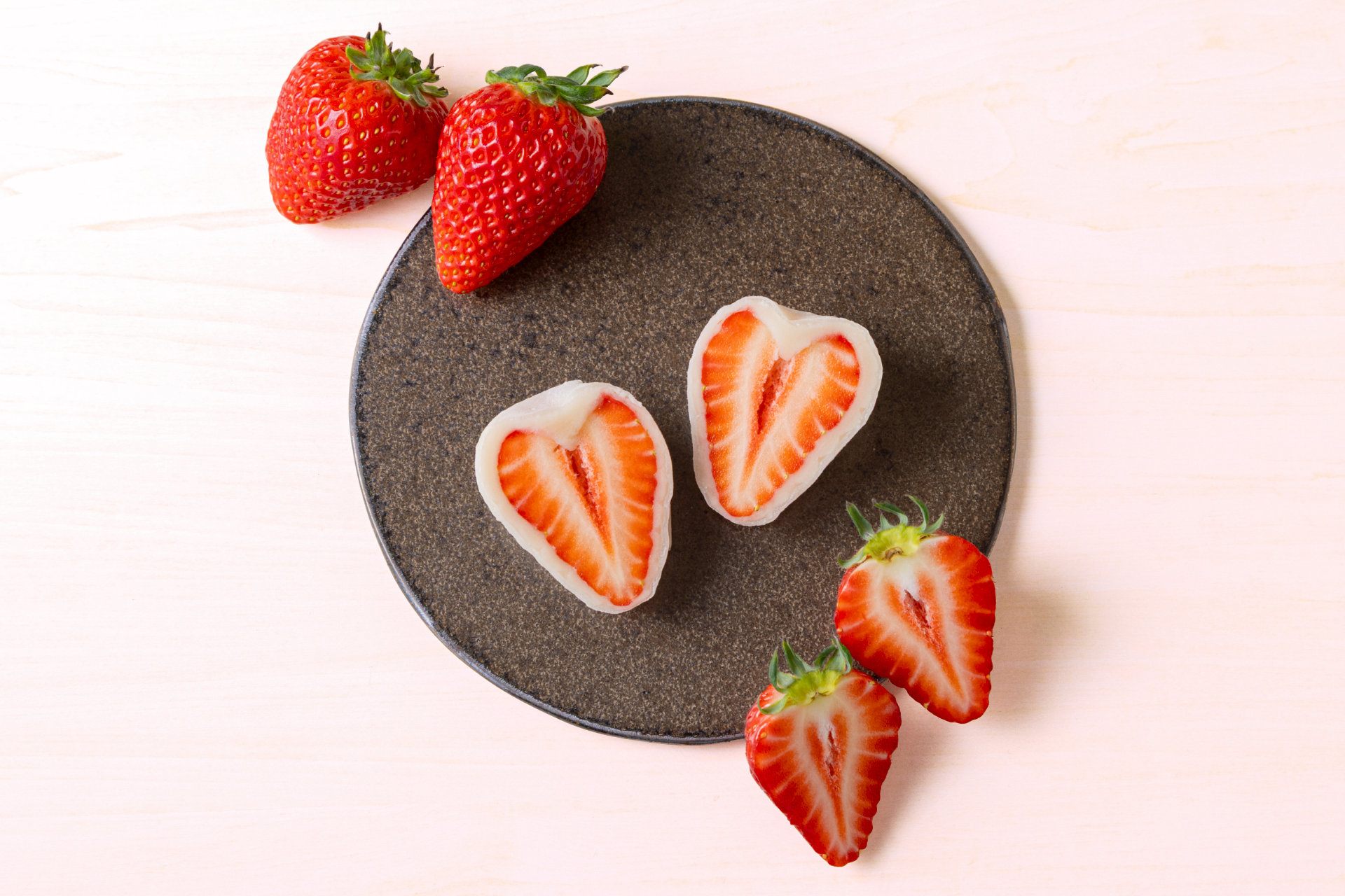 特別に選び抜いたいちごを、断面が美しいハート型になるよう、一つひとつ丁寧に仕立てたバレンタイン限定のいちご大福。
