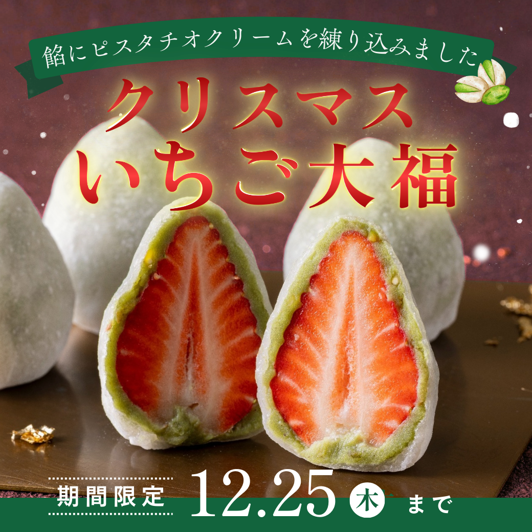 「クリスマスいちご」は、餡にピスタチオクリームを練り込み、苺の赤・餡の緑・求肥の白が揃う“クリスマスカラー”の華やかな一品。